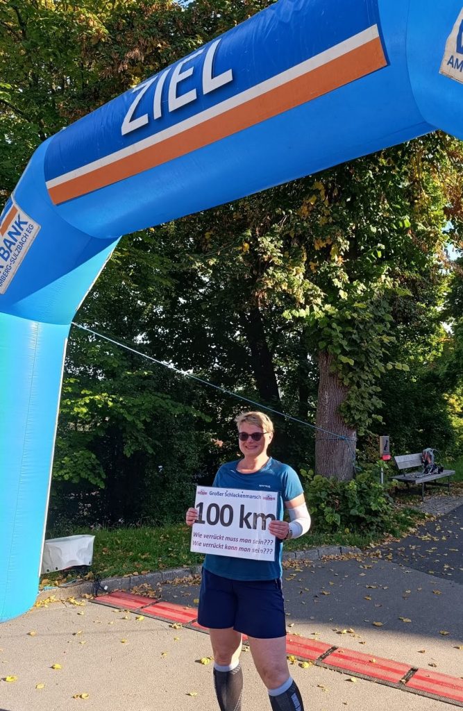 Und tatsächlich holte ich auf und kam auch wieder in Sichtweite der beiden Mädels. Eine blieb an der legendären Schnapsstation bei Kilometer 98 stehen (ja, so was gibt es wirklich ). Ich aber wusste: Wenn ich da jetzt anhalte, komme ich nicht mehr hoch. Also weiter. Schritt für Schritt, bis ich um 9:30 Uhr (pünklich nach 24 Stunden und zum Glockenläuten) durchs Ziel lief. Dort wurde ich freudig von Familie und Freunden erwartet und empfangen! Auch Buddy war dabei.