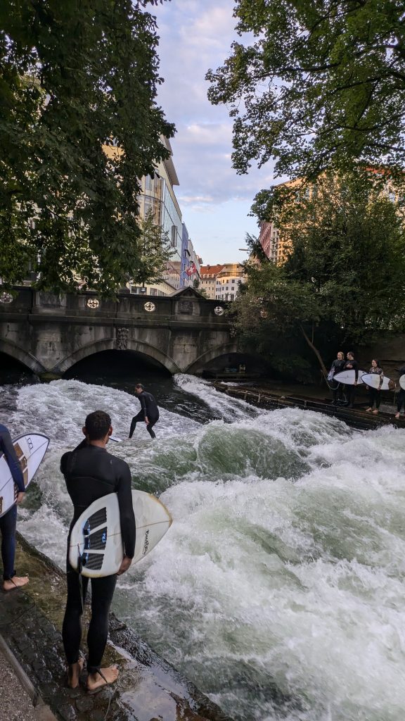 Die berühmte Eisbachwelle! Bereits vor 7 Uhr morgens standen dort tatsächlich 12 Surfende, die sich mutig den Wellen stellten. Ein echter Surfer Hotspot. Ich hätte stundenlang zusehen können – was für ein faszinierendes Schauspiel!