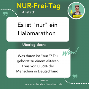 Wenn ihr das nächste Mal über euren Halbmarathon sprecht, streicht das „nur“ aus eurem Wortschatz. Ehrt euren Erfolg, denn ihr habt es euch verdient! Ein Halbmarathon ist keine Selbstverständlichkeit – es ist ein Meilenstein, auf den ihr stolz sein könnt. Ihr habt bewiesen, dass ihr die Disziplin habt, euch ein Ziel zu setzen und es zu erreichen. Und das ist alles andere als „nur“. Auch Zielzeit bzw. die Pace spielen in meinen Augen dabei eine absolut untergeordnete Rolle!
