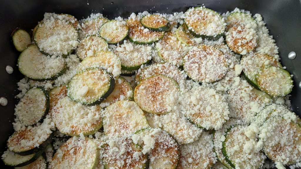 - Zum Schluss den Parmesan auf den Zucchini verteilen und ca. 15-20 Minuten (bei Sichtkontakt;