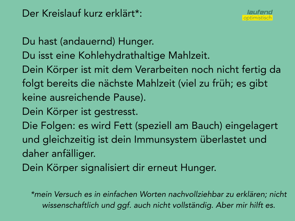 In meinem Fall war es so, dass mein Köper mehrmals täglich (schnelle) Kohlehydrate und oder Zucker zum verabeiten bekommen hat. Die Essenspausen waren zu kurz. Er war mit dem Verarbeiten der esten Mahlzeit noch nicht fertig, da kam bereits die nächste hinterher. Dies führte zu Dauerstress in meinem Körper. Fett (vor allem am Bauch) wurde eingelagert. Dazu hatte ich viele Infekte. Warum? weil mein Immunsystem andauernd auf Hochtouren lief und keine Kapazitäten hatte, sich zu wehren. Mir war das überhaupt nicht bewusst.