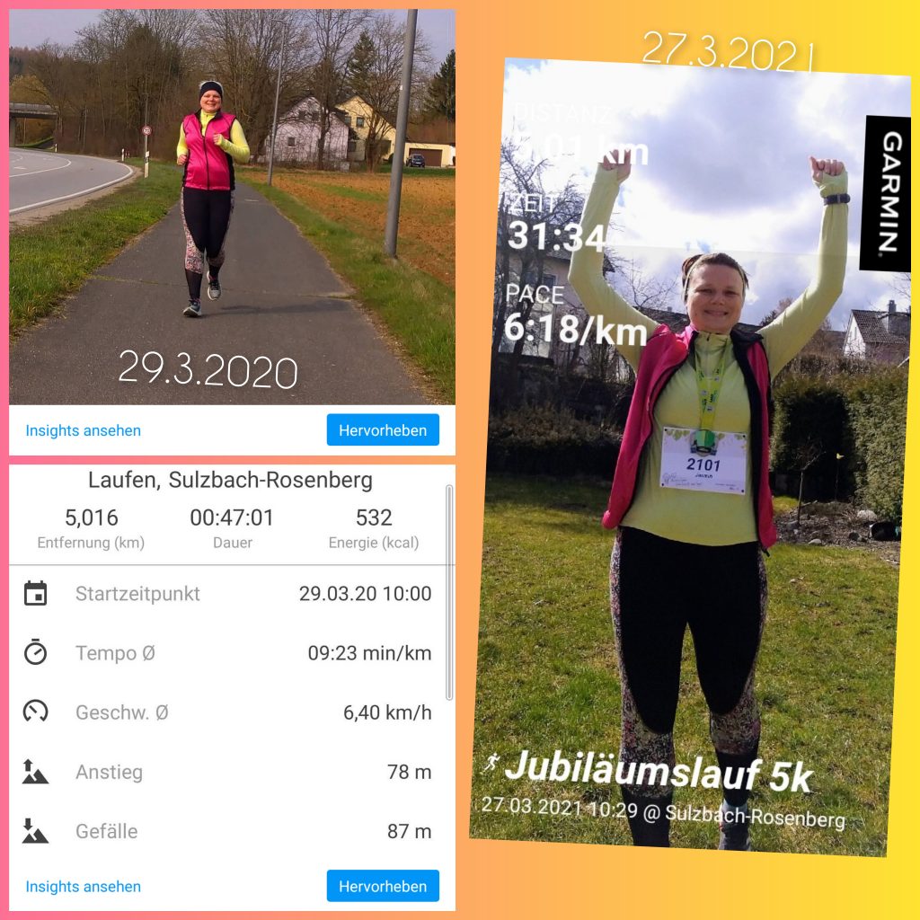 Auf den Fotos siehst du: 29.3.2020 mein allererster 5 KM Lauf! Ja mit dieser Pace kann man laufen. Ein Jahr später: meine Pace hat sich enorm verbessert und ich hatte viel dazu gelernt. Im Juni 2021 bin ich gemeinsam mit meiner Freundin in Nürnberg meinen ersten Halbmarathon gelaufen. Die dazu geplante Veranstaltung wurde coronabedingt abgesagt. Kurz darauf erhielt ich die Aussage „Verdacht auf Schilddrüsenkrebs“ und um August 2021 wurde mir dann die Schilddrüse entfernt. Der Krebsverdacht hat sich zum Glück nicht bestätigt. Die ersten Monate danach ging es mir schlecht. Doch ich hatte ein Ziel und den Willen auch ohne Schilddrüse wieder laufen zu wollen.
